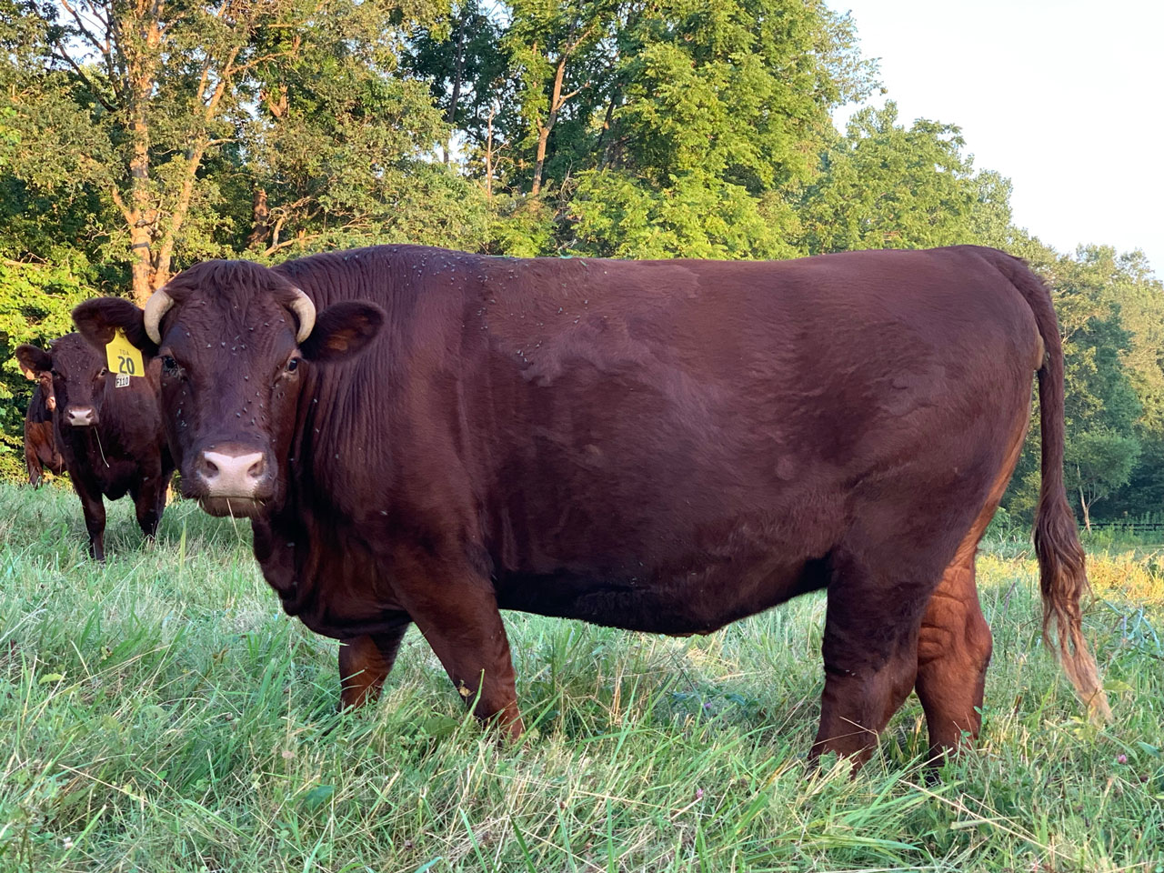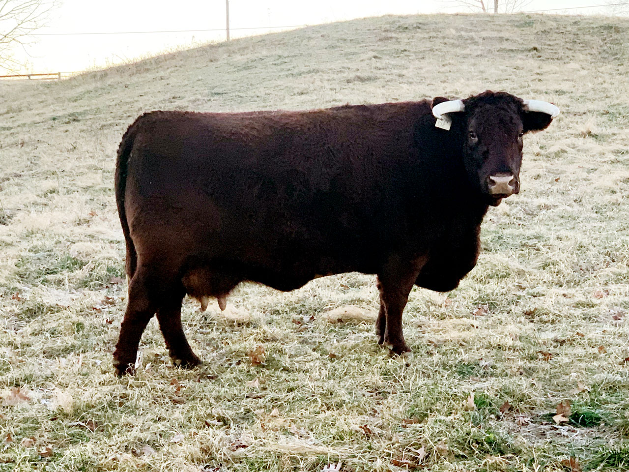 WMD 2 has joined us through a circuitous route. Her dam was the daughter of a beautiful cow, Lakota’s R6. Mom was sold to Bill Ketner’s farm in West Virginia and while hauling a bull one day Church spotted 2…and the rest is history. Her sire was the English bull Highwayman. The result is this cow who looks more traditional than some of her herdmates. Note the deep Ruby red hair coat!