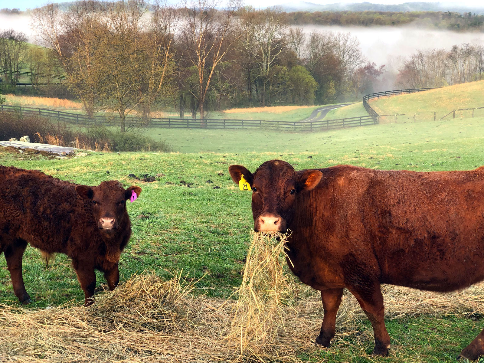 The steer calf in the picture is half English…the full English cow sharing the hay was calved at Thistle Hill and is out of the Tilbrook and Cutcombe herds in England.