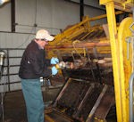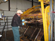 ….yes, sometimes some cows need a pedicure. Regina Tesnow of Tomina Farms sends a photo of one of her animals getting a trim. Look carefully, or enlarge the picture, to see the hooves jutting out. The cow has been walked into a chute that is actually a tilt table. She was turned on her side for the work.
