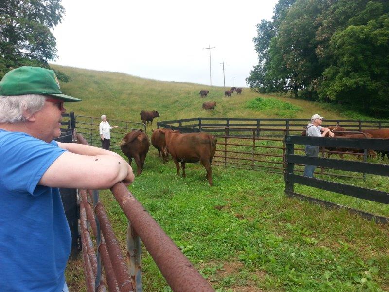 When we get a steer, it’s aimed to another pen where Kurt Volkert (left) is controlling the gate. Afterwards the steers are moved across the road to a large pasture with other cows awaiting shipment to farms that have purchased our seed stock. Tomorrow the steers will be brought in for loading.