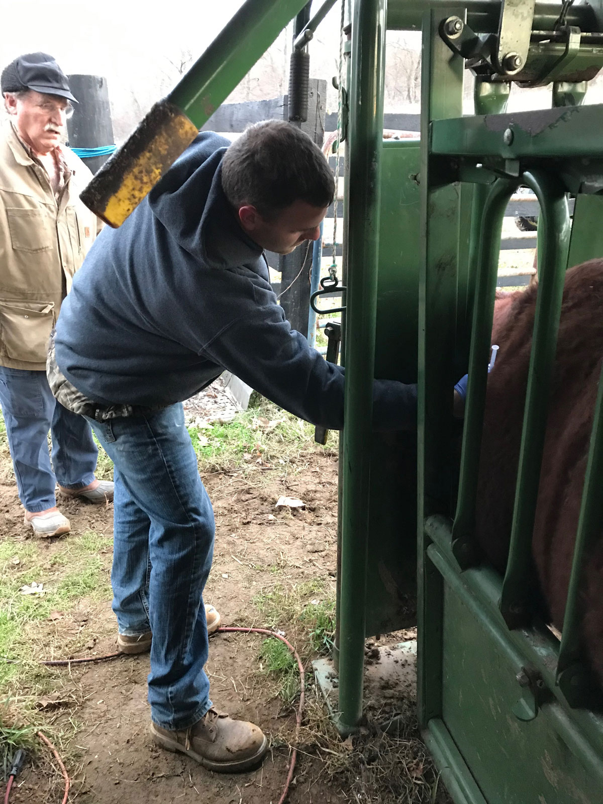 Grandson Church is really in charge now. He administers a shot of lutalyze which will bring the cow into heat in 48-72 hours. Dad Curt (in background) is the Chief Wrangler, bringing the designated cows into the chute.
