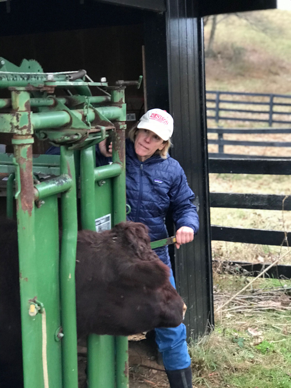 Mom Carolyn is “manning” the headgate. Gotta grab ‘em just right or it’s back around and try again. How many farms have a gynecological cancer surgeon in their crew?