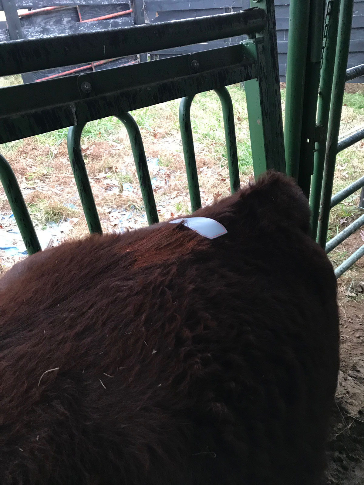 The final step: putting an alarm patch on the rump. When she goes into heat, others cows will mount her turning the patch a bright red. Then it will be time to inseminate.