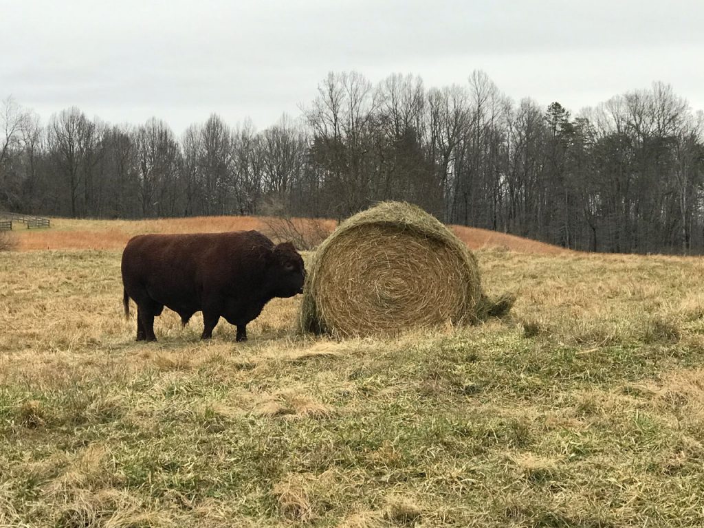…and a Christmas morning treat for the venerable Highwayman. He gets a year off and his very own bale of hay while we test his younger full brother in this year’s heifers!