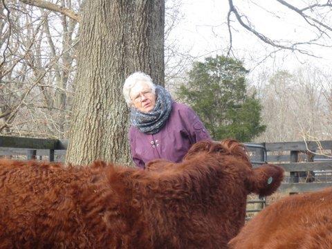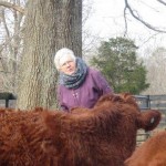 IMG_3110….hasn’t quite been the proverbial “piece of cake”.  Wooz has done pretty well and of course I’m inside the tractor.  Here she checks our first-calf heifers to see how they withstood below zero temperatures the night before.