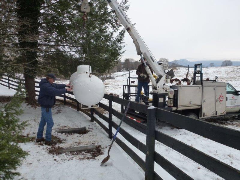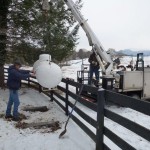 Workmen lower a propane tank into place to power Thistle Hill’s new 20kw emergency generator. Until now we’ve made do with an older and smaller version that could not supply all our appliances, particularly 5 freezers, at the same time.