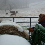 Actually this last mini-storm was the worst kind:  a sheet of ice under a little snow.  Footing and traction are treacherous and the netting is frozen to the bales of hay.  I use the front loader to crack the ice somewhat and I even drop them from about eight feet…..but it’s still a job for Wooz to rip off the netting.