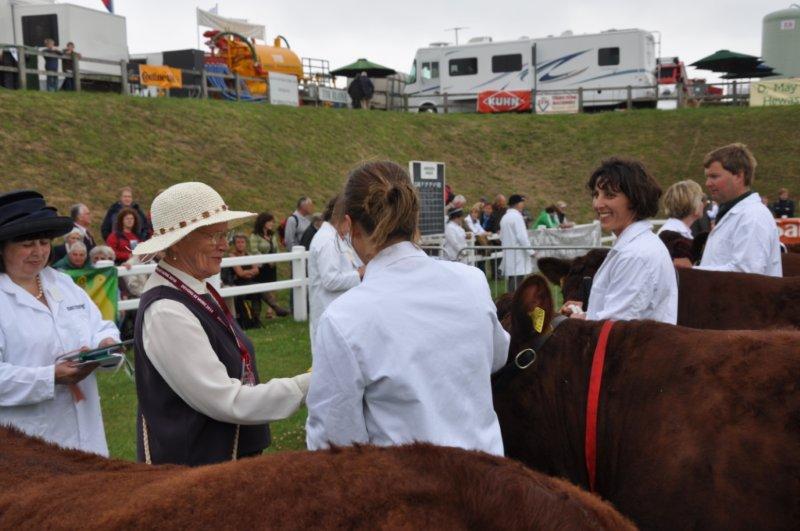 And as long as we’re at the Royal Cornwall, here’s a picture of Wooz awarding the ribbons at the cattle judging. Hat got a little smashed during the bus ride, but the Brits appreciated the gesture.