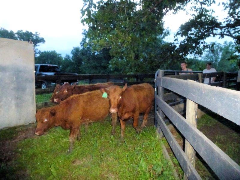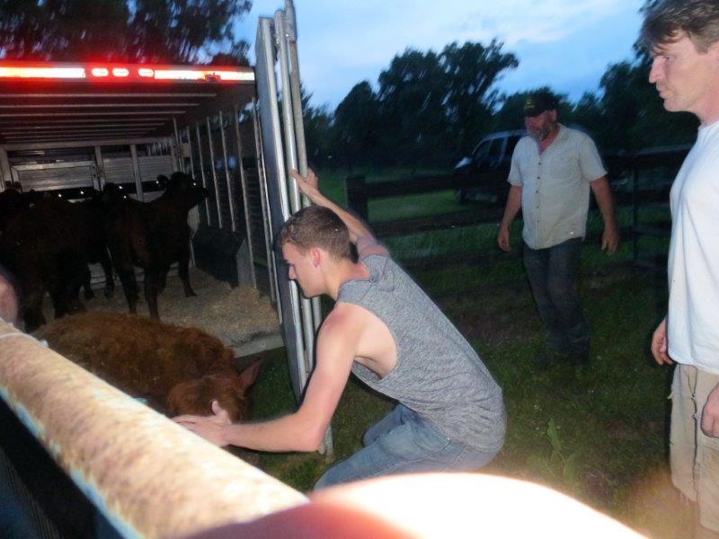 A group of six of our heifers…two bred and these four just yearlings…were loaded for the trip to Canada just before dark last night. Grandson Church Matthews and Duane Ard are shepherding them on board.