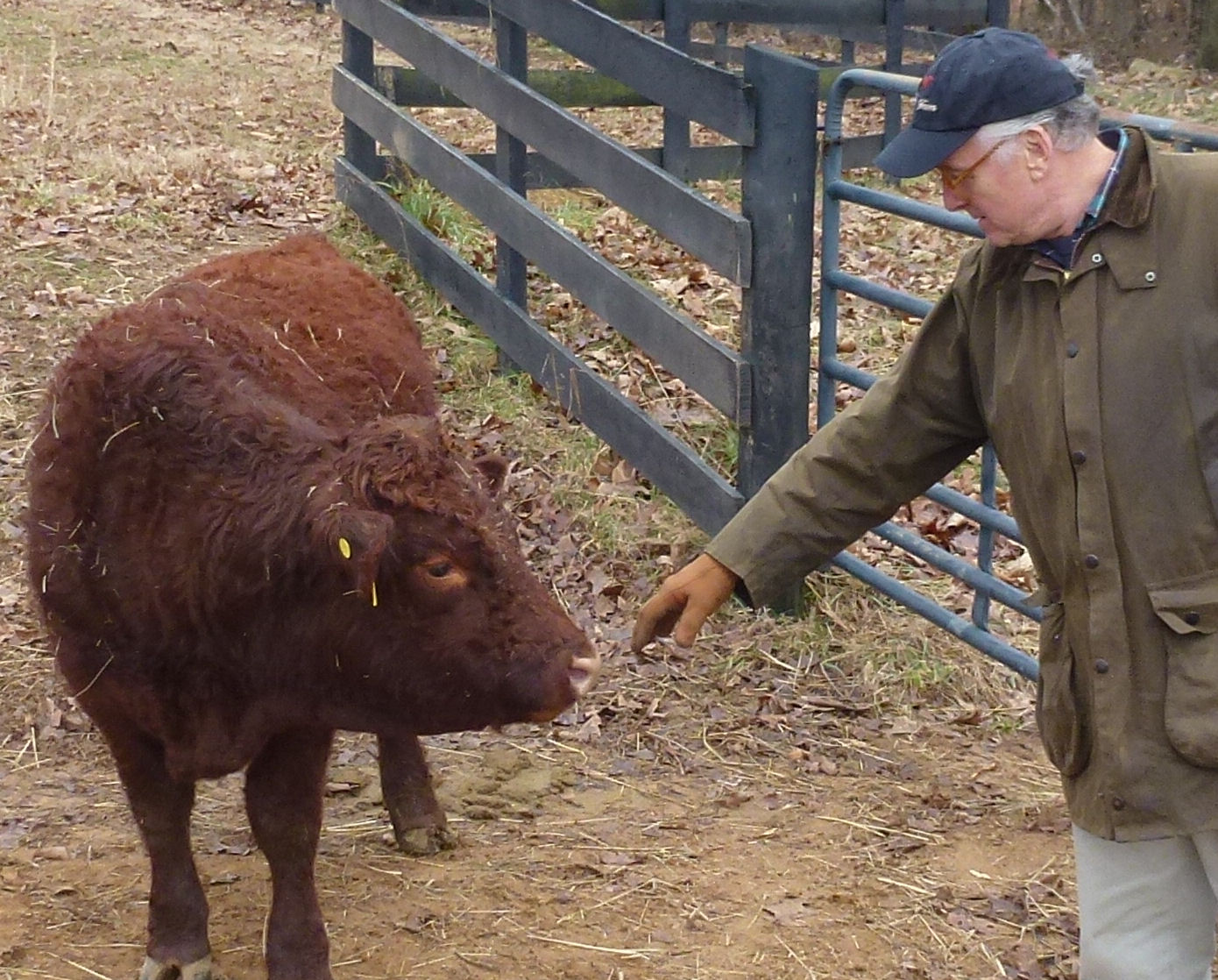 ….our friend and partner in the English Devon project, John Forelle, stopped by and renewed acquaintances with TDA Churchill. He’s a year old now (the bull, not John) and even more than most of our herd likes to come up and check out visitors.