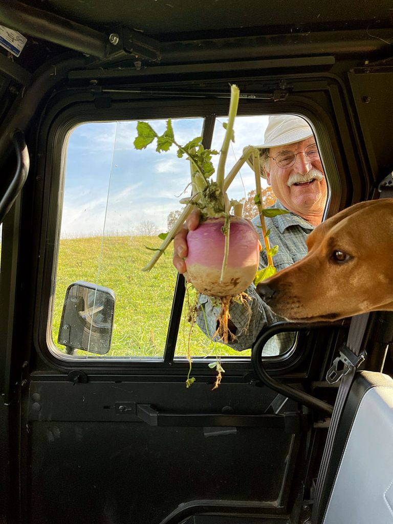 Agriculture, David, Grass, Pasture, Soil Grass is always greener—II November 21, 2021 / No Comments Just a quick add…pictures of the turnips we’re getting (with our hound) and the radishes. Add in the roots we left behind and you get an idea of the wonderful impact in the soil! David