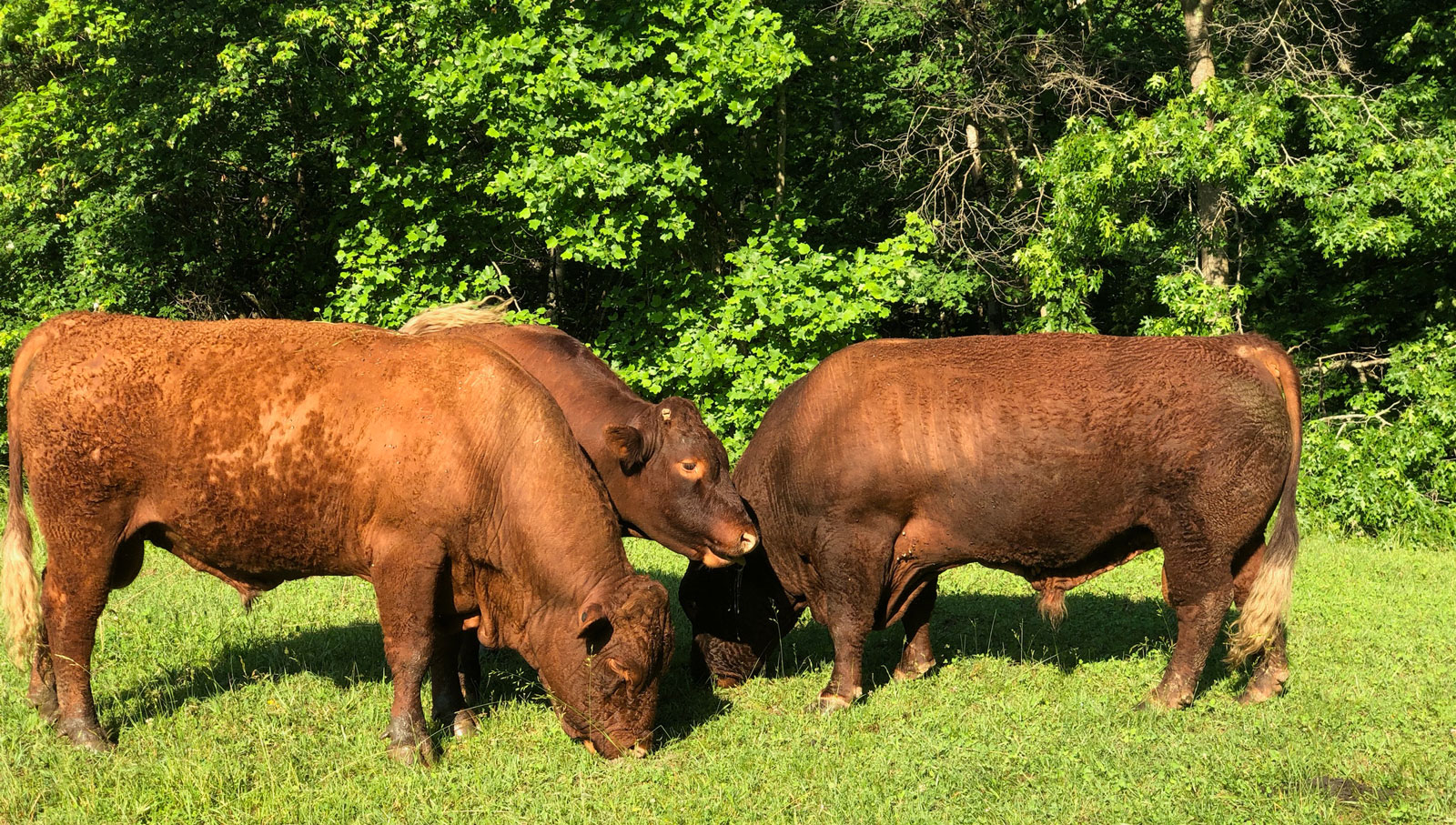 …three of our bulls doing their own version of intensive grazing. On the left Guardian, a Rotokawa-bred animal, and then two of our English bulls, Essington and Highwayman. The last two are both sired by the great Ashott-Barton bull, Millenium Falcon.