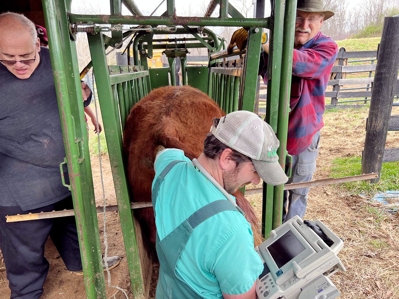 …Dr Kiel Hausler of Rose Hill Vets using ultrasound to preg check one of our young cows.
