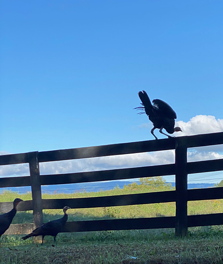 Almost all our pastures have adjacent riparian areas including water.  But our partners are increasing bold.  These turkeys are right in front of the main house.
