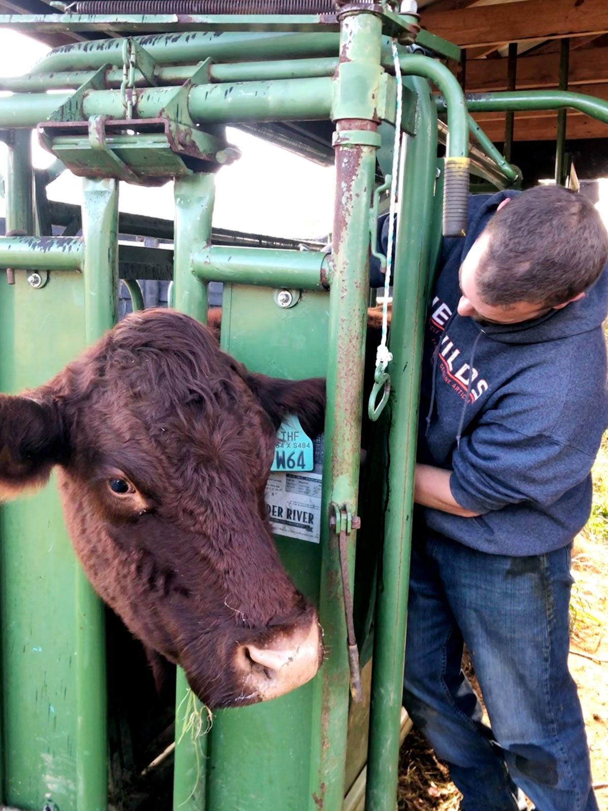 …Church moves the first group of cows into the chute to begin the process of artificial insemination. This will be his first solo effort and he’s set an ambitious schedule…almost 30 heifers and cows to bring into heat.