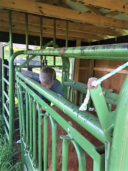 Again, we’re congratulating ourselves for choosing Red Devon some years ago….they are calm and easy to handle in this sensitive project. You can see the current calves relaxing just outside the pen. The process takes about 10-15 minutes per cow, including moving them into the chute and headgate.