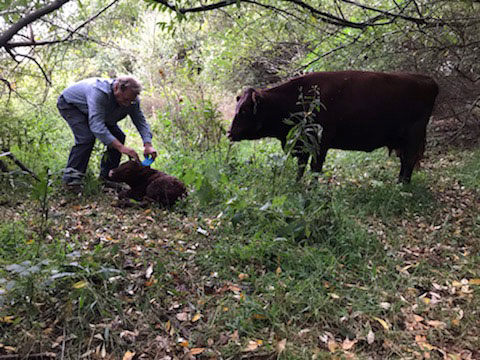 Riparian areas are great—and we have them all over Thistle Hill—but it makes it tough to find new calves. The mothers are often no help…looking in a direction away from their baby, I’m sure to mislead us!