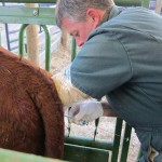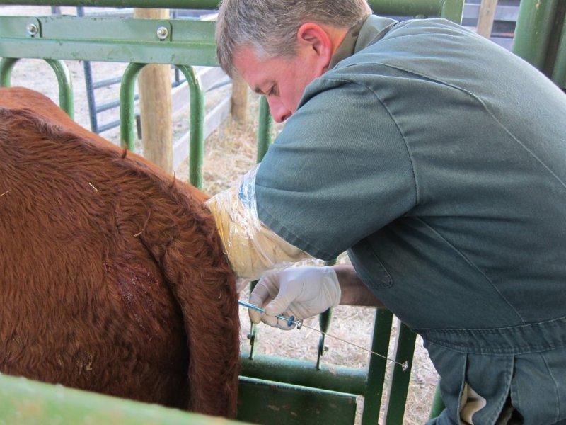 Our longtime vet, Dr. Tom Massey of Rose Hill Veterinary Services, joked he was the only one with warm hands.  And for the uninitiated this is how it’s done.  The frozen embryos are kept in a liquid nitrogen canister.  When the cow is in the chute, and double-checked for readiness, the embryo is quickly withdrawn from the canister, inserted into warm water to thaw, and then placed in a plastic sleeve which is inside the metal tube you see here.  If you look carefully, you’ll see the button at the end of the tube.  When things are aligned just right, Tom pushes the plunger and the embryo is deposited in (we hope) just the right place.