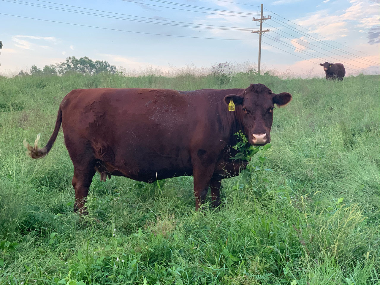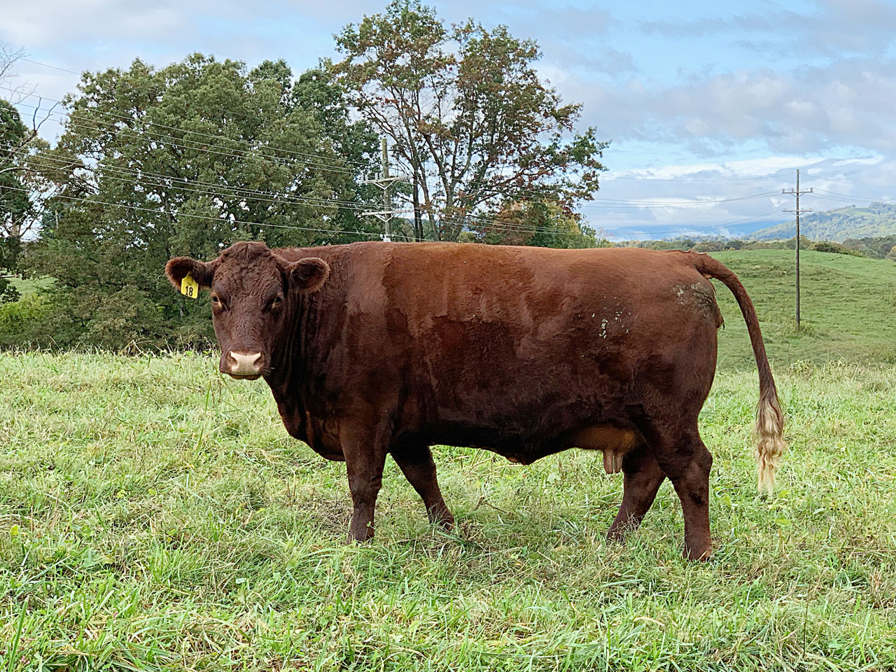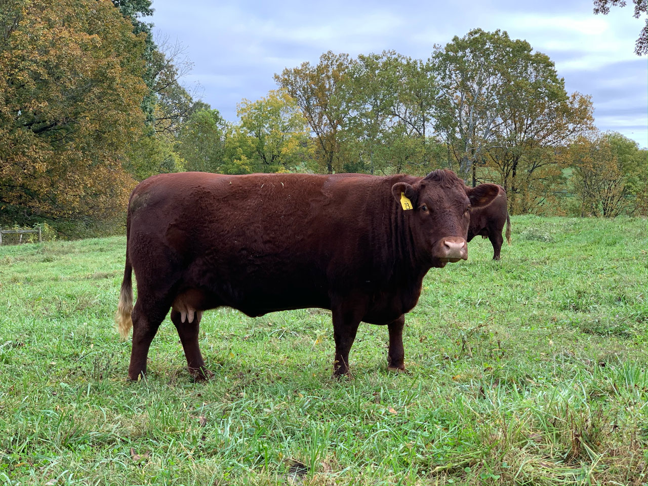 WMD 2 has joined us through a circuitous route. Her dam was the daughter of a beautiful cow, Lakota’s R6. Mom was sold to Bill Ketner’s farm in West Virginia and while hauling a bull one day Church spotted 2…and the rest is history. Her sire was the English bull Highwayman. The result is this cow who looks more traditional than some of her herdmates. Note the deep Ruby red hair coat!
