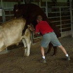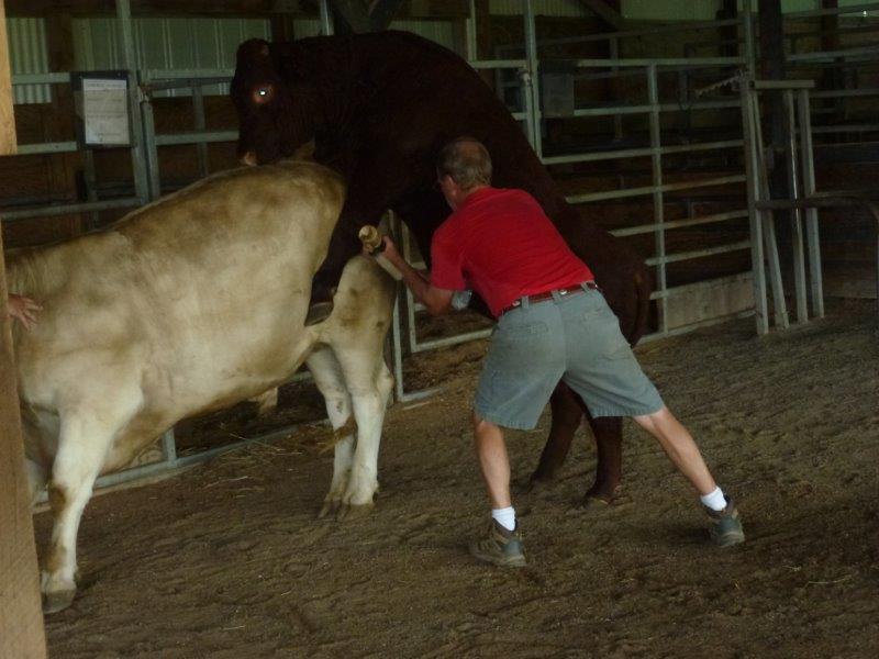 ….the folks at North American Breeders wondered if this young English Devon bull had the experience to mount a bigger steer in the middle of a barn…no restraints for either. They needn’t have worried.