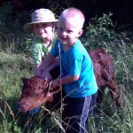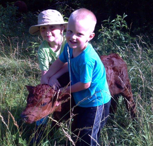 The picture is on a Tennessee farm. We could have titled it our “Alumni Club”….the baby bull (a Devon cross) is backed with Thistle Hill genetics.
