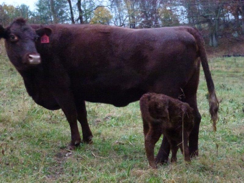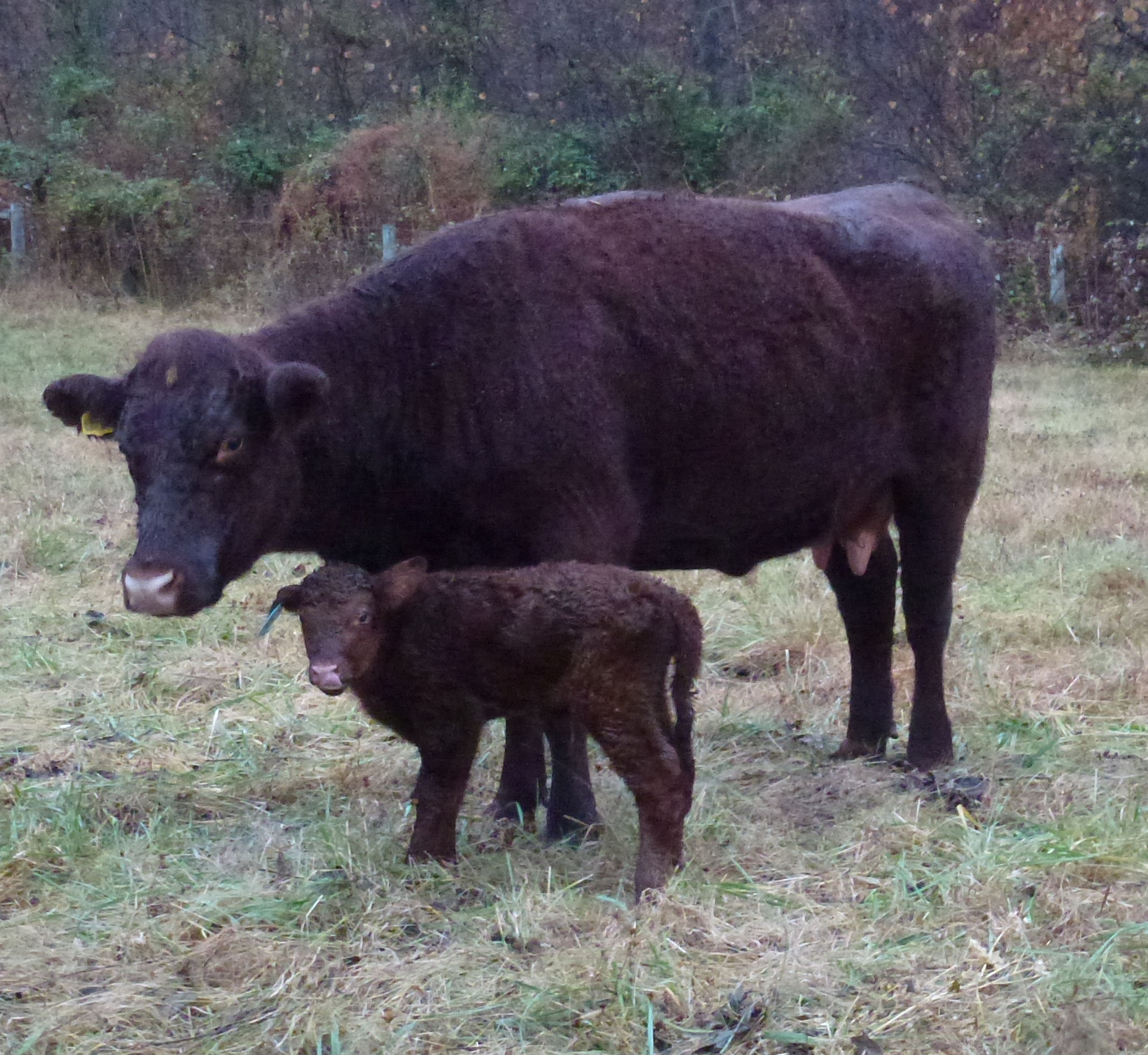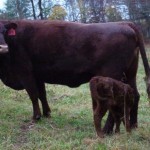 Old hat now for “R3“….her bull calf is by Thistle Hill Reality. Just a guess but it was almost as though both cows (standing about 50 feet apart, which is unusual) delivered between two cloud bursts at just about the same time.