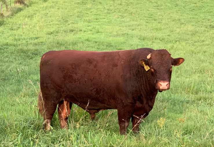 A full English bull by Ashott Barton Millennium Falcon out of Goldings Norah. An imported embryo calved and raised at Thistle Hill.