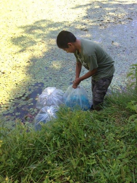 course, everyone is put to work so I can supervise. Here Luis is emptying bags of bass, blue gill and koi into our pond. At the fish hatchery where we picked up the young ones, Luis got impatient that nothing was biting at the Zett’s pond near Inwood, West Virginia, and simply put his hand down in the water and grabbed a catfish almost two feet long.