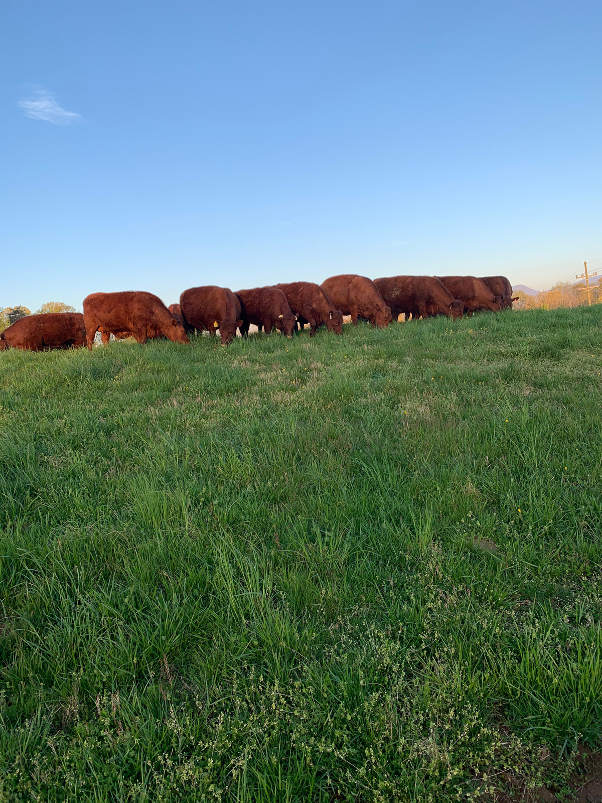 I guess the larger one in the center helps demonstrate the uniformity of the rest of the herd. She’s part Senepol bred to a Devon bull, an experiment we tried to demonstrate the prepotency of Devon genetics. And an independent study at Clemson university demonstrated meat from the Devon-cross was indistinguishable from pure Devon.