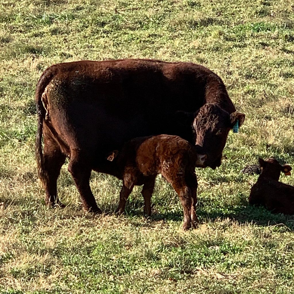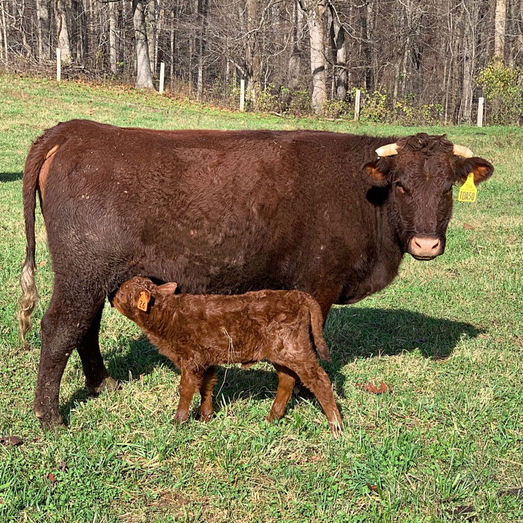 THF 26 is our lightest calf this season…just 45 pounds. Mom is small and a heifer. She wasn’t sure what to make of the whole thing at first but now the little heifer is packing on the pounds. Sire is our English bull, Ransom.