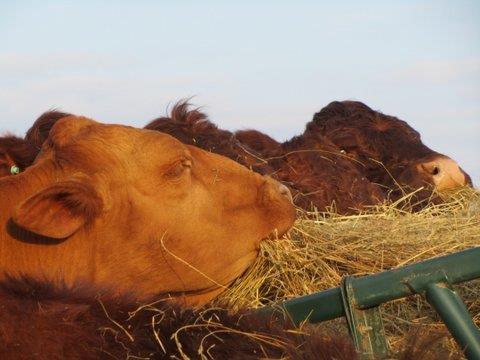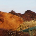 ….we’re still feeding a little hay though warm temps have been greening up the pastures. That’s one of our Senepols in the foreground—always a chow-hound—and Devon in the back. We “tested” Senepol years ago and, while we like them a lot, decided Devon would do better in our environment.