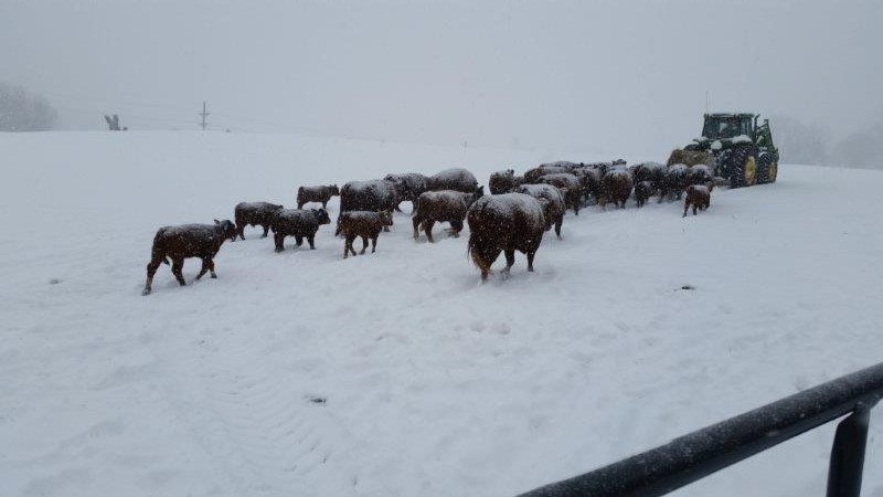 We bring the bale out on the spear…Wooz unwraps it at the gate…I go in and bounce it on the ground to shake some hay loose. The cows concentrate on that small pile. I move away and set down the bale…grab it with un-roller and off I go. On the way out I pick up Wooz at the gate (if I remember).