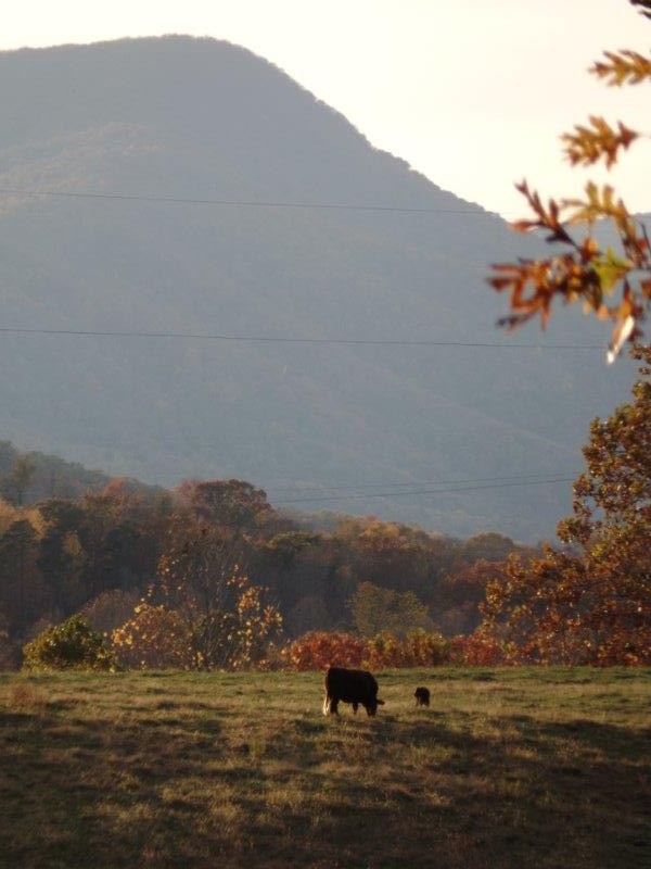 Yesterday, one of those moments. A young mother leads her very first calf to safety away from the herd at sunset. The Blue Ridge is the backdrop.