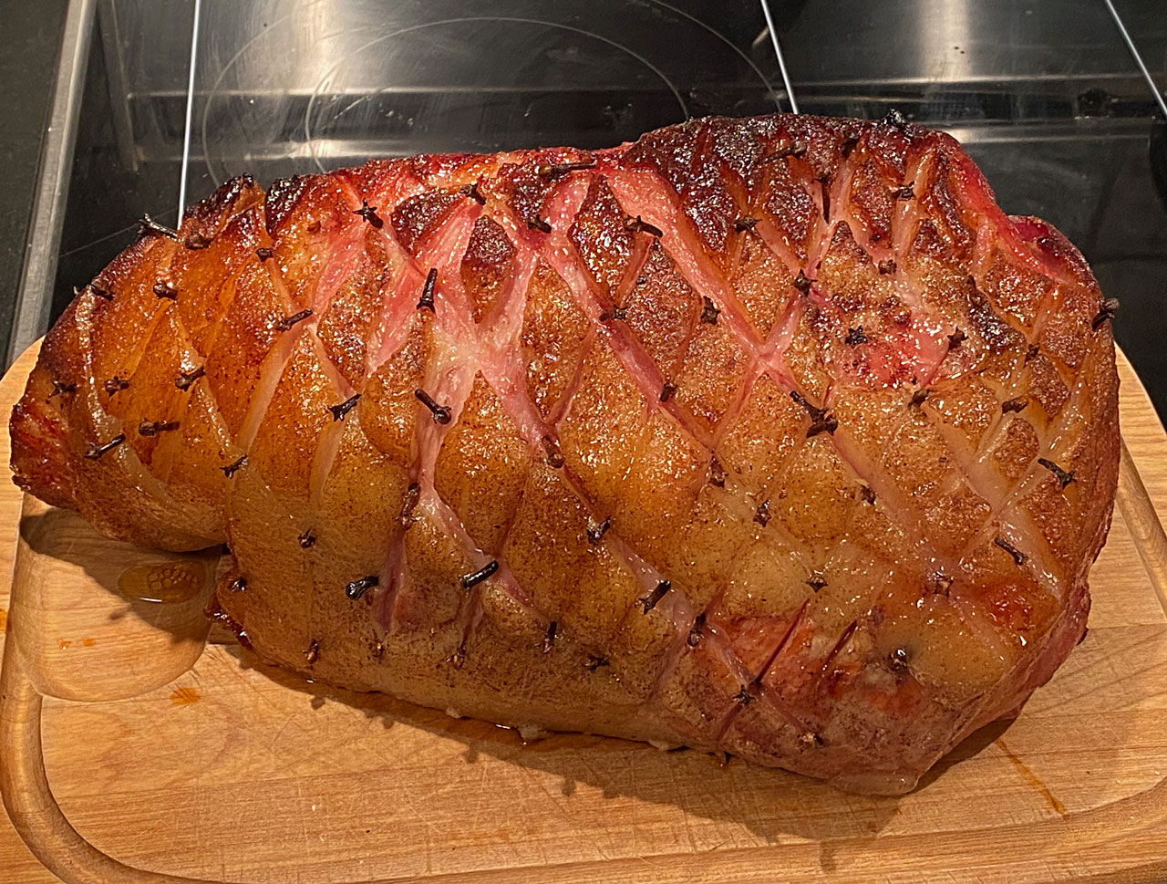 It starts with scoring the ham than patting on a mixture of cardamom, cinnamon, ginger, allspice and kosher salt. Have to punch cloves in, of course.