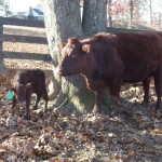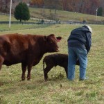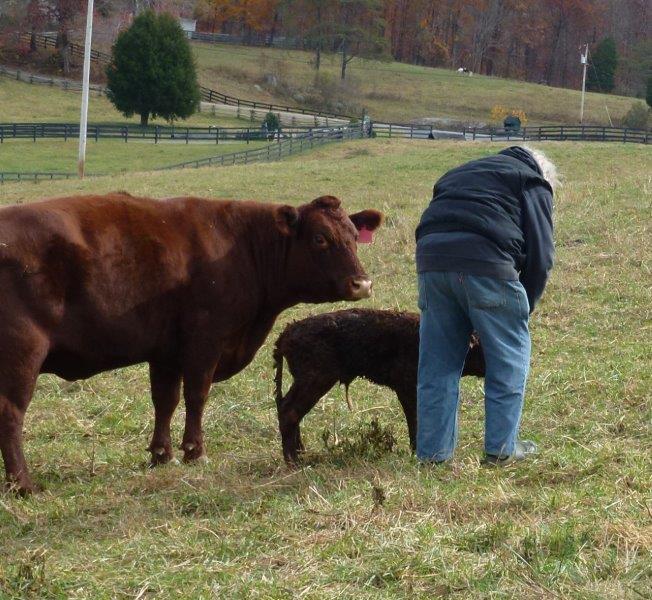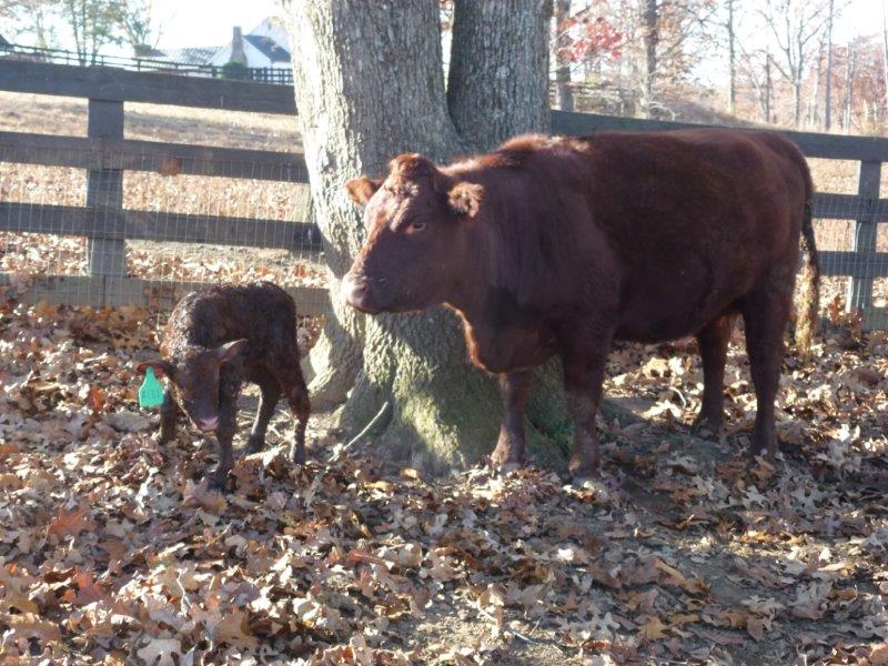 ….the first of two calves born today at Thistle Hill. The first, a bull calf, was delivered in our “nursery”…a small area near the house where we keep an eye on “first calvers”. It was no problem for W64….she found a safe area and delivered before we could come out and monitor the event. The sire is Thistle Hill Reality.