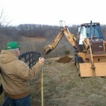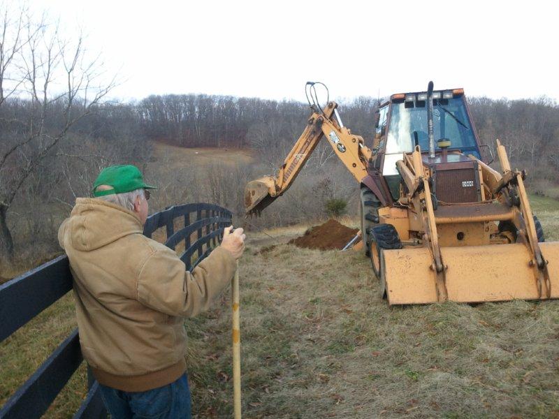 ….by adding all-weather water points. These non-freeze waterers (if there is such a word) will give us greater flexibility to move our herd around. Neighbor Herman Harlow is at the controls of the back hoe and I’m imitating a highway construction crew.