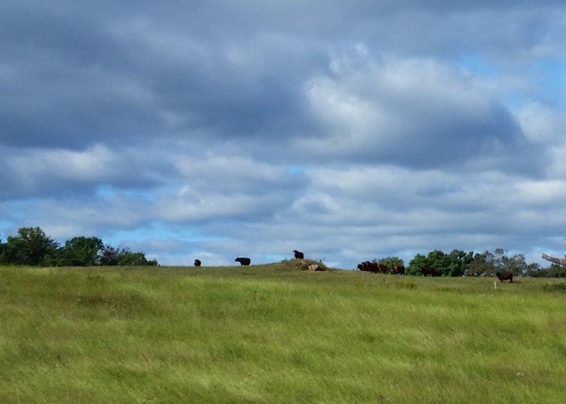 ….the main herd watched this morning as we put a new, huge water tank in the Eastern pasture. They’ve been patiently waiting….and watching that succulent stand of Italian rye on the other side of the wire. Our chief-of-everything, Duane Ard, noticed the advance guard on the horizon while filling the tank. A few minutes later we were surrounded!