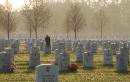 Uncategorized What can you say? March 20, 2012 / No Comments A bald eagle perched on a tombstone at the national cemetery outside Minneapolis. (Our thanks to Bill Roberts of 12 Stones Grassland Beef)