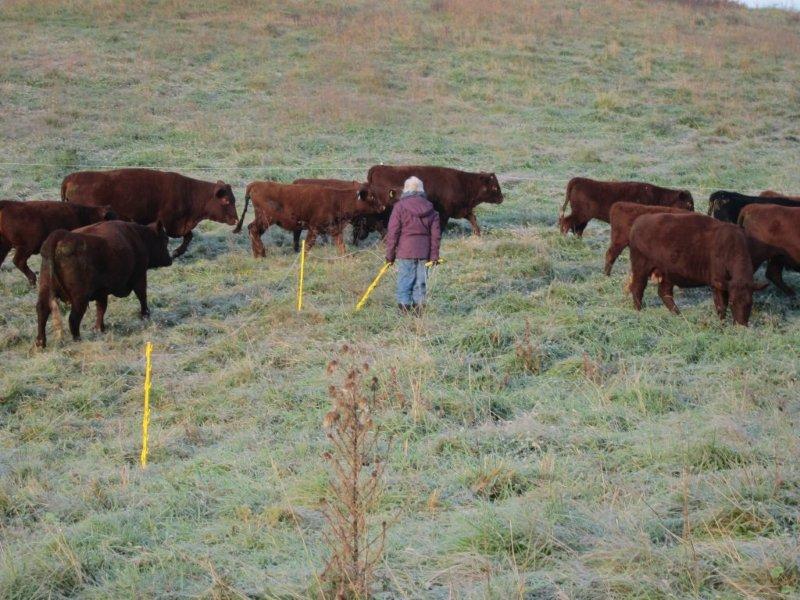 So here’s how we start the day each morning: Wooz removing the electric wire to permit access to the fresh grass and the cows, who have been waiting patiently right there for perhaps an hour, moving quietly through, accepting their praise.